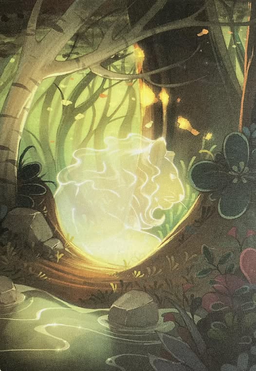 На карте изображен светящийся лев, уходящий или улетучивающийся в глубину леса. Он повернулся направо в знак прощания, его немного печальный взгляд уходит в пол. Голые ветки деревьев склоняются в направлении движения льва и возможно ветра. На первом плане виден небольшой водоем, в котором лежит камень и отражается свет уходящего льва. Вокруг водоема цветут цветы, зелень, напитанная водой, начинает покрывать тропинку, по которой еще совсем недавно прошел лев. Карта выполнена в золотисто-зелено-серых тонах.