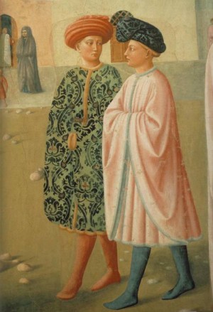 Купец[1] в богатых одеждах[2] взвешивает монеты[3] на весах[4] и раздает милостыню нищим[5,6] на балконе[7]. На заднем плане дорога, ведущая через зеленые поля к белому замку[8].