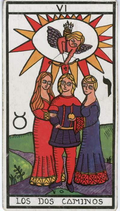 В колоде EL GRAN TAROT ESOTERICO карта носит название ДВЕ ДОРОГИ. Предмет внимания VI Аркана – выбор человека между Пороком и Добродетелью.
