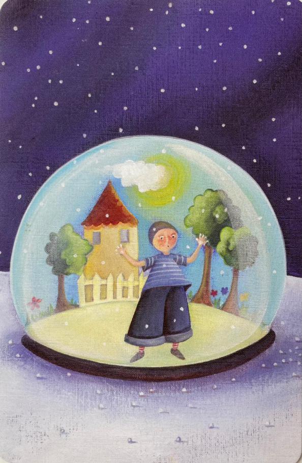 И есть еще одна тема у этой карты. Возможно в стеклянном шаре - это мы в нашем счастливом детстве и теперь, возвращаясь в воспоминаниях в это время, мы черпаем тепло и уверенность в том, что выживем в снежной пустыне жесткой жизненной реальности. Где-то в глубинах нашей души есть такой светлый шар, наполненный теплом и солнцем.