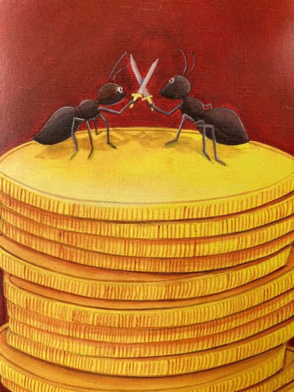 Золотые монеты - это не только богатство в прямом смысле. В политическои контексте это может быть непосредственно чье-то богатство, ставшее предметом конфликта, это также может быть и распределение богатства (например вакцин) в мире среди различных групп населения и среди различных стран и так далее, или же это другая актуальная тема в обществе, которая вошла в крайне конфликтную фазу развития и которая имеет высокую ценность для населения или определенных групп населения.