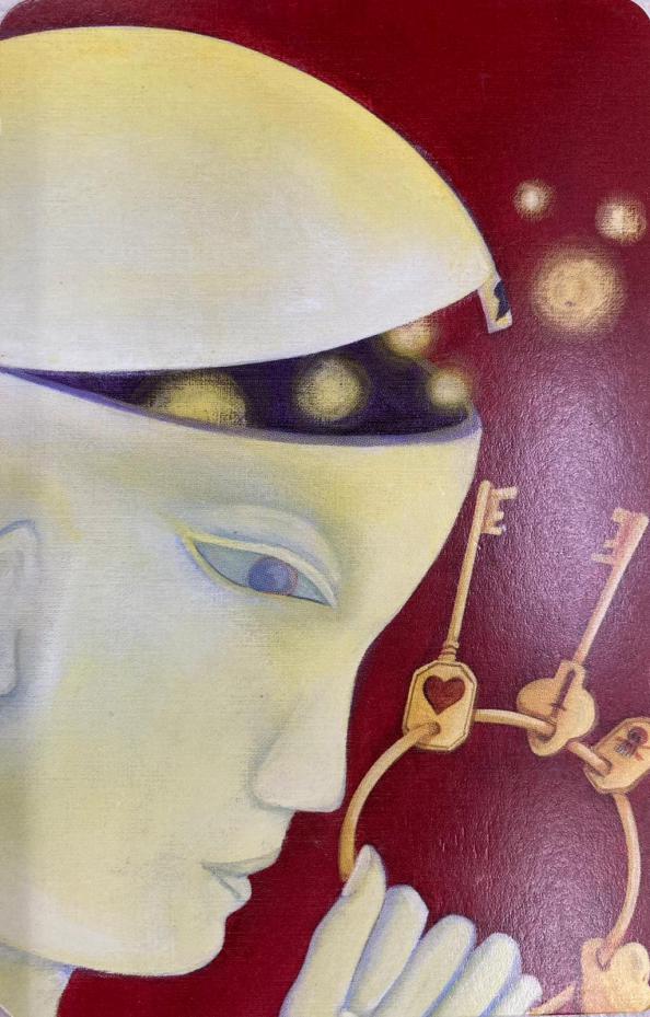 Голова фигуры в области лба открыта, на лбу виден замок, который был открыт одним из ключей или же всеми ключами. Из головы вылетают светящиеся шары разной величины золотистого цвета.