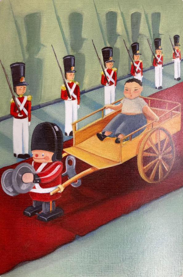 На карте изображен ребенок, сидящий на желтой повозке. Повозку тянет оловянный солдатик. Повозка едет по красной дорожке, с правой стороны которой салютируют оловянные солдатики. Тянущий повозку оловянный солдатик выглядит по одеянию рангом выше чем те солдатики, которые салютирует повозке. Помимо этого у этого оловянного солдатика есть заводной ключик и он отбивает марш, подчеркивая таким образом важность того, кто сидит в повозке. Фон карты салатно-зеленый, приятный. Униформа оловянных солдатиков красно-белая, праздничная.