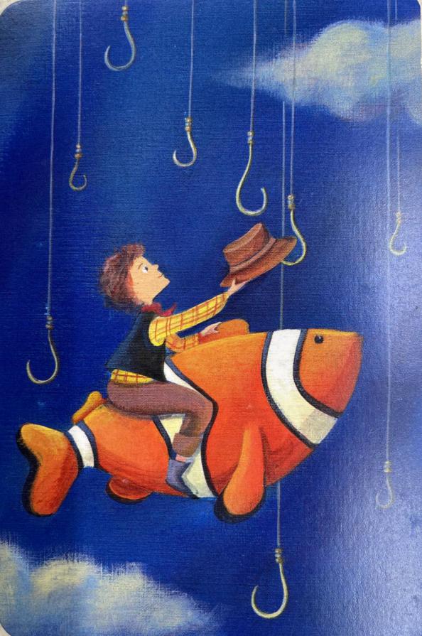 И теперь перейдем к особенно интересной части карты - к крючкам. Среди неба висят крючки, они предназначены для рыбки-клоуна и ковбоя на ней. И по количеству крючков можно судить о том, что есть много желающих заполучить рыбку с ковбоем, на обоих ведется настоящая охота. Помещая на крючок свою шляпу, ковбой скорее всего пытается таким образом отвлечь охотников и исчезнуть из виду, пройти удачно опасное место охоты. Но нельзя исключить и то, что, вешая шляпу на один из крючков, ковбой заякоряется, то есть он делает выбор в пользу этого крючка и таким образом садиться на крючок. Добровольно.