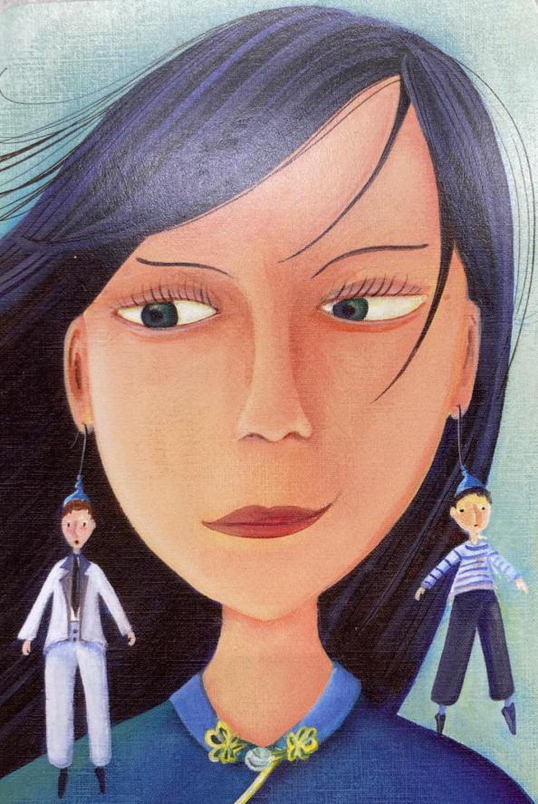 На карте изображена женщина (изображение до плеч). У женщины несколько необычное украшение, а именно две сережки в образе двух мужчин. Фон карты голубо-серый. Одеяние женщины - синего цвета и закрытого покроя.