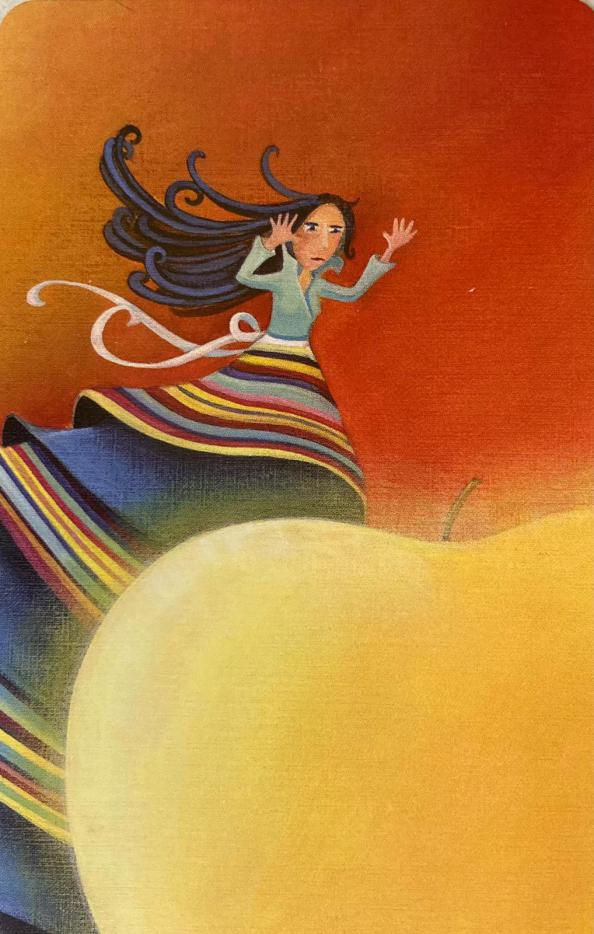 Яблоко есть желанный обьект. Сама склонна думать, что карта больше о чувствах, скорее всего о сильной любви и страсти (об этом говорит фон карты и интенсивность красок). В этом варианте женщина или боится чувства любви и поднимает руки, чтобы защитить себя от этого лучистого и сильного чувства, или же она хочет взять яблоко в руки и попробовать его на вкус или же она заклинает яблоко любовью или другими чувствами, чтобы дать обьекту своей любви.