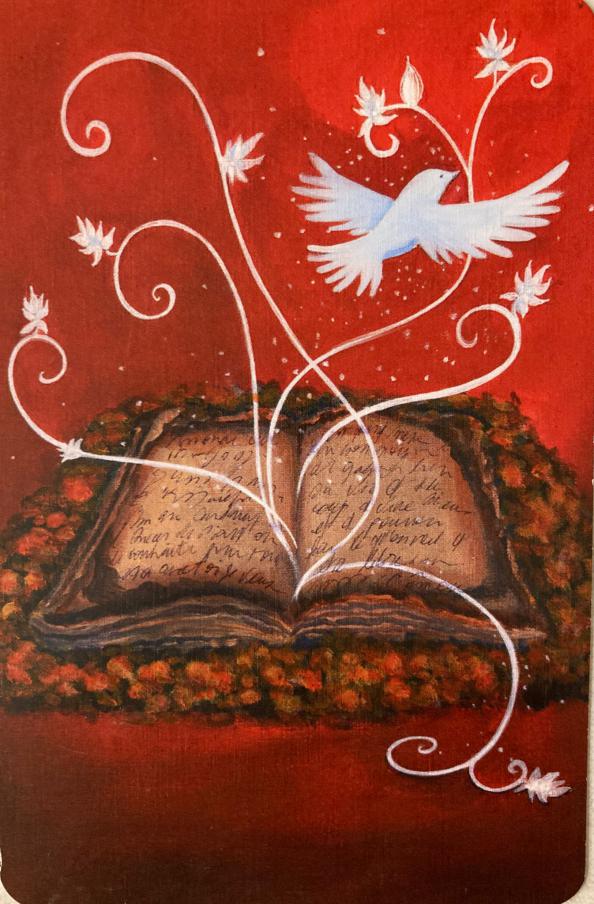 На карте изображена развернутая книга, лежащая на тлеющих углях. Страницы книги рукописно плотно исписаны. По краям листы книги тлеют и исчезают. Из середины книги растут белые стебли с белыми листьями. И среди этих стеблей пархает белая птица (скорее всего голубь). Фон карты красно-багровый, насыщенный.