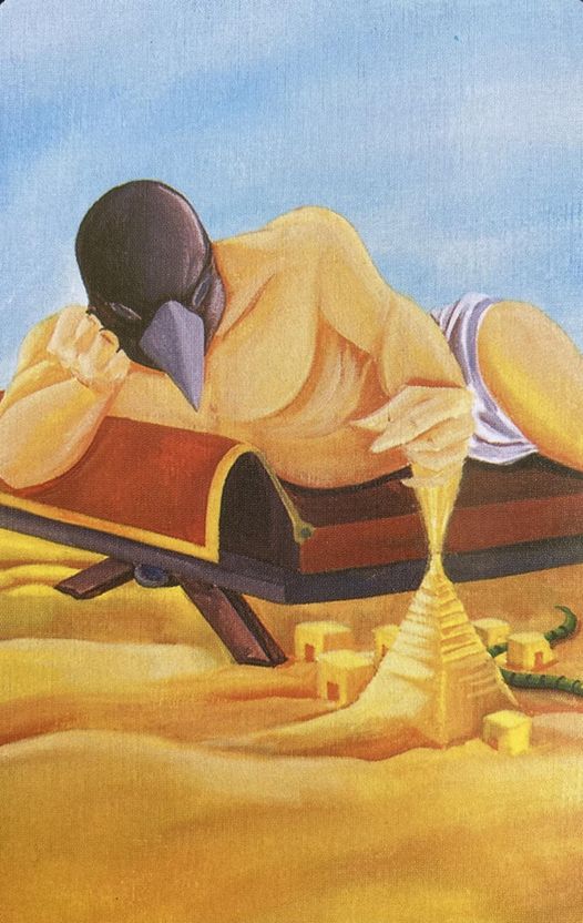 На основной карте изображен человек в тёмной маске птицы и острым клювом, лежащий в белых плавках на лежаке в песчаном ландшафте (сложно сказать, есть ли это берег моря, песок может быть и в пустыне). Человек подпер голову рукой и в задумчивой позе воздвигает из песка пирамиду (речь скорее всего все же о пустынном ландшафте, Африка?). Возникающая пирамида изображена в форме песочных часов. Вокруг пирамиды находятся дома в форме кубов (типичные постройки жарких регионов планеты). Между домами ползёт змея.
