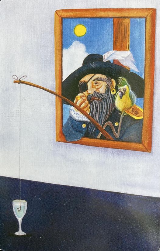 На карте изображен мужчина в военной форме прежних времён (капитан судна или даже пират) с попугаем на левом плече, грустно смотрящим из окна и на фужер с жидкостью (скорее всего спиртное). Удочкой мужчина пытается выловить из фужера нечто. Фон карты черно-белый. За мужчиной видно голубое небо с солнцем и облаками. (Эта карта выпала на Израиль в прогнозе по странам)