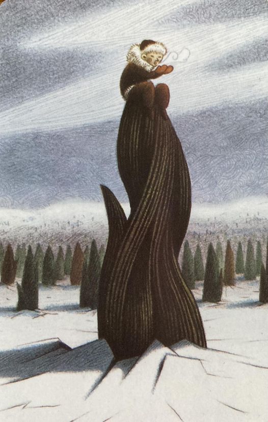 На карте изображен холодный зимний ландшафт, но несмотря на холод на поле пробиваются первые посланники весны в форме небольших росточков. На ростке на первом плане карты сидит человечек и греет руки своим теплым дыханием. Человечек умело держится на ростке и смотрит на восток или же направо. Карта выполнена в серо-белых тонах.