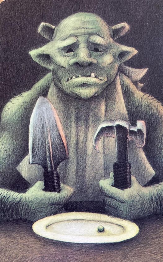 На карте изображен людоед с трагичным выражением лица. Людоед сидит за обеденным столом, в руках у него лопата и секира. Перед людоедом стоит тарелка с горошиной. Фон карты темно-коричневый.