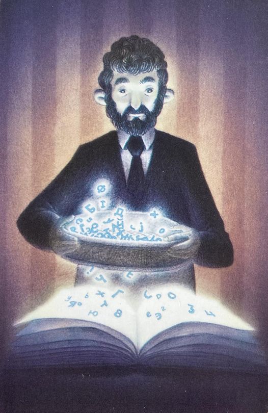 На карте изображен человек средних лет, при галстуке и в деловом костюме. Он держит в руках сито с буквами разных алфавитов, числами и знаками, которые он просеивает на белые листы бумаги. Сито и листы бумаги излучают свет.