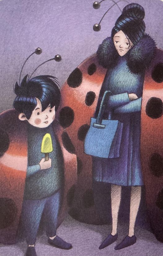 На карте изображены женщина (мать) и ребенок (сын) в образе божьих коровок. Ребенок ест мороженое, мать стоит около ребенка с немного озабоченным взглядом и ждёт. Фон карты фиолетово-сиреневый.