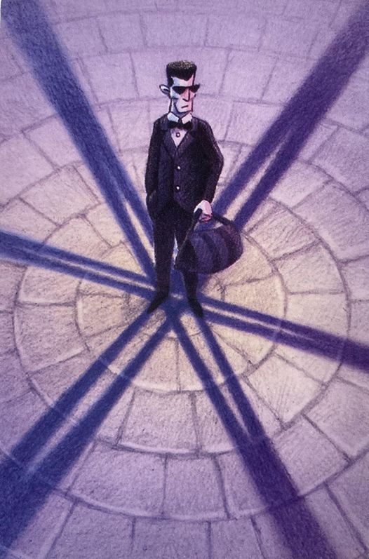 На карте изображен человек в черном костюме при бабочке и солнцезащитных темных очках. В одной руке человек держит сумку, другую же руку он опустил в карман. Человек в черном стоит в центре карты и круга, вымощенного брусчаткой. Во все стороны от человека падают тени, а именно в шести направлениях. Фон карты фиолетово-сиреневый.