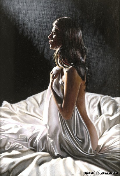 Она о чем-то задумалась..Белые простыни контрастируют с темным, черно-коричневым занавесом, нежное тело- с темными волосами, а дальний правый задник картины- приглушенно- серый, завершающий повествование..
