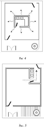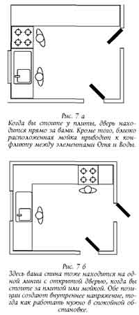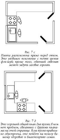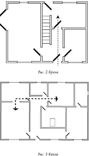 Поэтому расположение кухни имеет очень важное значение. Вход на кухню не должен располагаться прямо напротив парадной двери (см. рис. ), так как в этом случае она не будет защищена от потока потенциально вредоносных энергий, проникающих в дом снаружи. Нельзя устраивать кухню у входа в дом, иначе у людей сложится впечатление, что вас интересует только еда. Кроме того, в традиционном представлении это означает, что богатство (которое символизирует пища) будет легко утрачено. Жар от плиты и различные вещества, попадающие в воздух во время приготовления пищи, не должны проникать в другие комнаты, поэтому в кухне не следует иметь дверей, смежных со спальней или гостиной . Если такие двери есть, а перепланировка нежелательна, держите их плотно закрытыми, когда на кухне готовят еду.