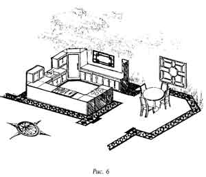 Эпицентром кухни в фэн-шуй считается кухонная плита: именно к ней должна быть обращена символическая фигура змеи, и по ней определяется положение остальных священных животных, о которых мы говорили в предыдущем разделе книги. Прочная стена за ней - это черная черепаха. Свободное пространство перед ней, где находится повар, - это красный феникс. Высокие буфеты и/или холодильник на подставке занимают свою естественную позицию слева (зеленый дракон), а справа находятся более низкие предметы обстановки, такие, как разделочные столики, мойка или посудомоечная машина (белый тигр). Конечно, это идеализированная картина, но она дает общее представление о традиционном расположении элементов.