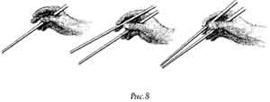 Умение обращаться с палочками требует некоторой практики, но быстро входит в привычку. Их берут примерно на четверть длины от верхнего, более толстого конца.